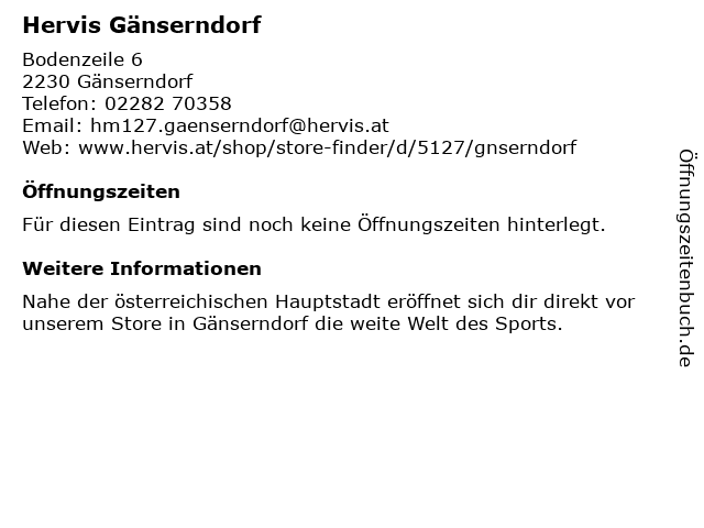 | Öffnungszeiten Hervis Gänserndorf in Gänserndorf anzeigen | |