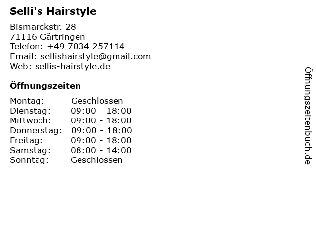 | Öffnungszeiten Selli's Hairstyle in Gärtringen anzeigen | |