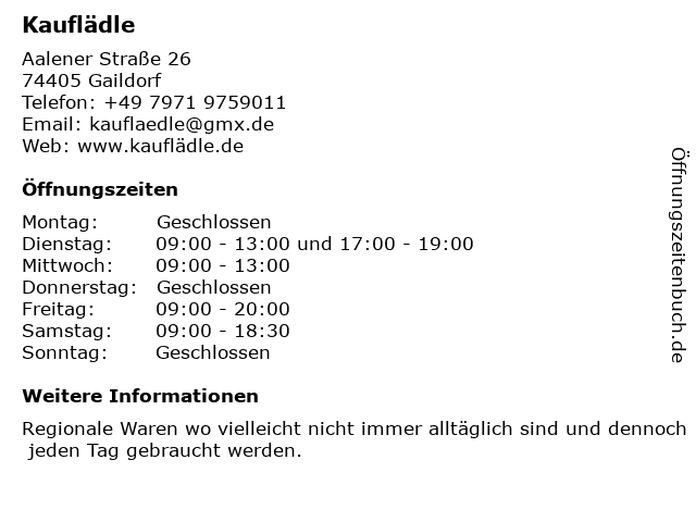 | Öffnungszeiten Kauflädle in Gaildorf anzeigen | |
