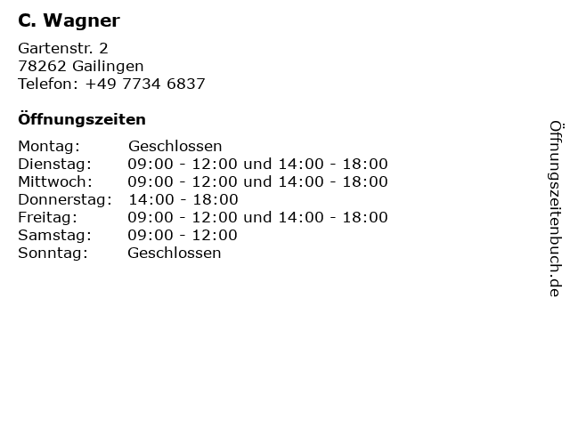| Öffnungszeiten C. Wagner in Gailingen anzeigen | |