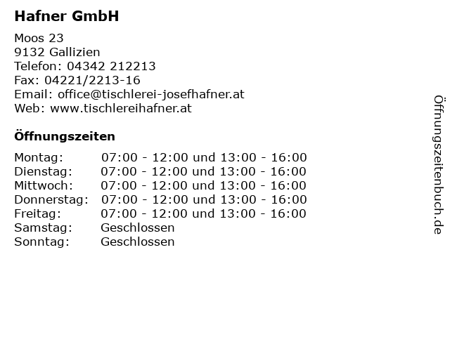 | Öffnungszeiten Hafner GmbH in Gallizien anzeigen | |