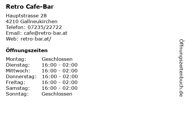 | Öffnungszeiten Retro Cafe-Bar in Gallneukirchen anzeigen | |