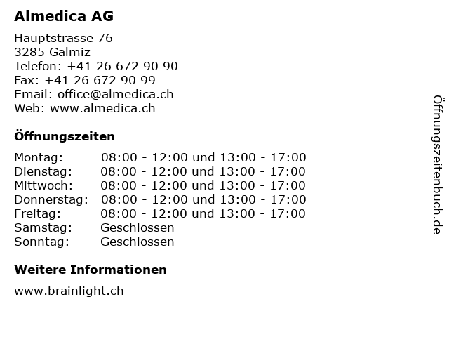 | Öffnungszeiten Almedica AG in Galmiz anzeigen | |