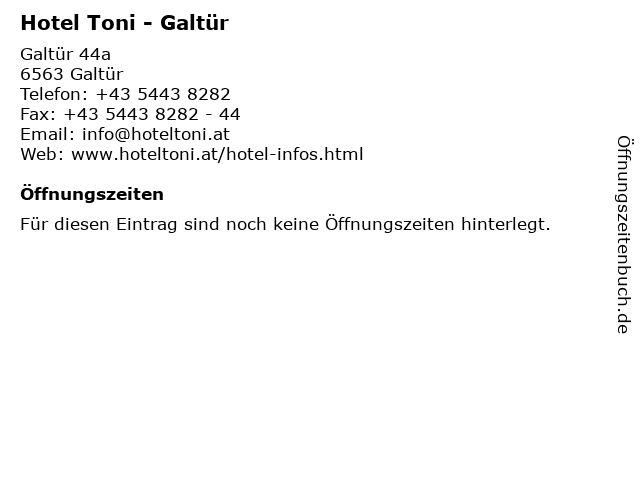| Öffnungszeiten Hotel Toni - Galtür in Galtür anzeigen | |