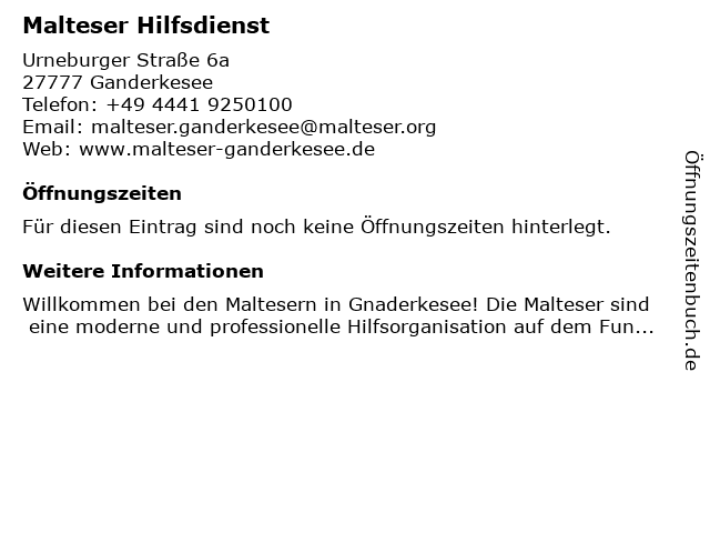| Öffnungszeiten Malteser Hilfsdienst in Ganderkesee anzeigen | |
