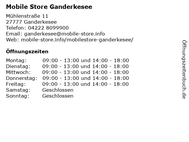 | Öffnungszeiten Mobile Store Ganderkesee in Ganderkesee anzeigen | |