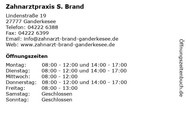 | Öffnungszeiten Zahnarztpraxis S. Brand in Ganderkesee anzeigen | |