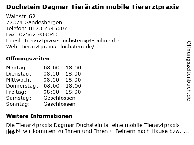 Branchen & Suchbegriffe zu Duchstein Dagmar Tierärztin mobile Tierarztpraxis:dagmar, duchstein, mobile, tierarztpraxis, tierärztin |