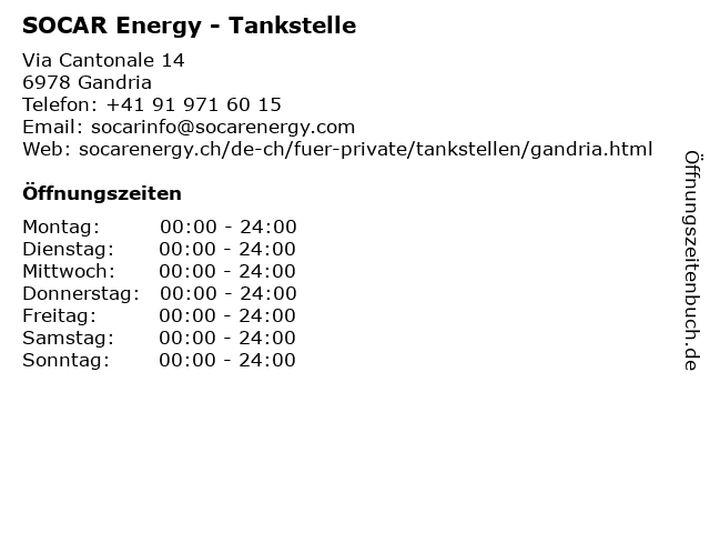 | Öffnungszeiten SOCAR Energy - Tankstelle in Gandria anzeigen | |