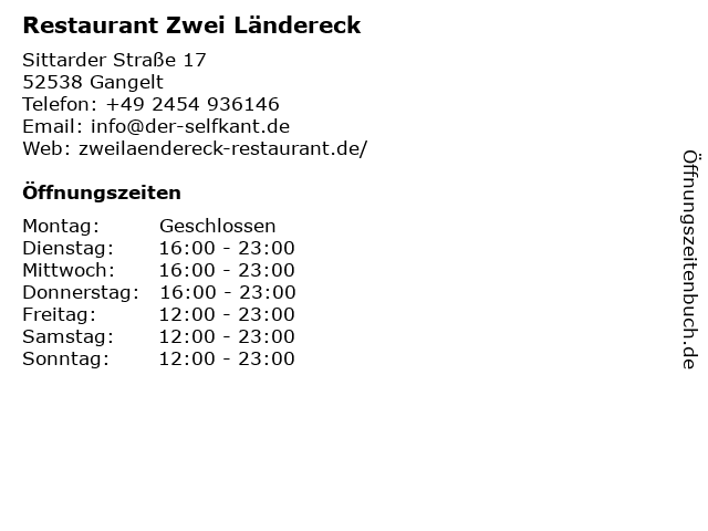 | Öffnungszeiten Restaurant Zwei Ländereck in Gangelt anzeigen | |