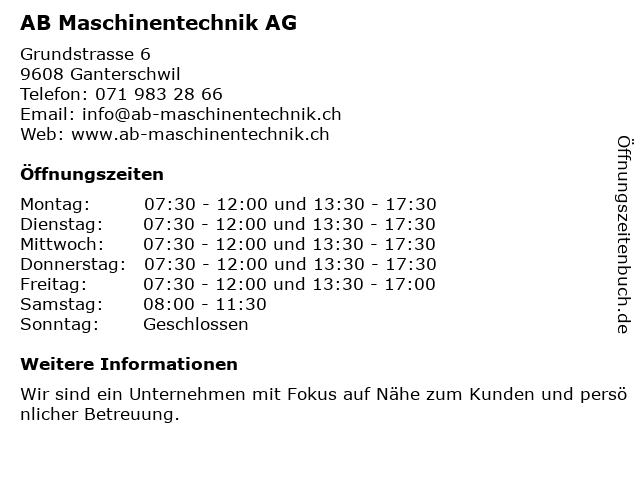 | Öffnungszeiten AB Maschinentechnik AG in Ganterschwil anzeigen | |