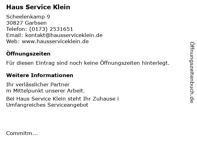 | Öffnungszeiten Haus Service Klein in Garbsen anzeigen | |
