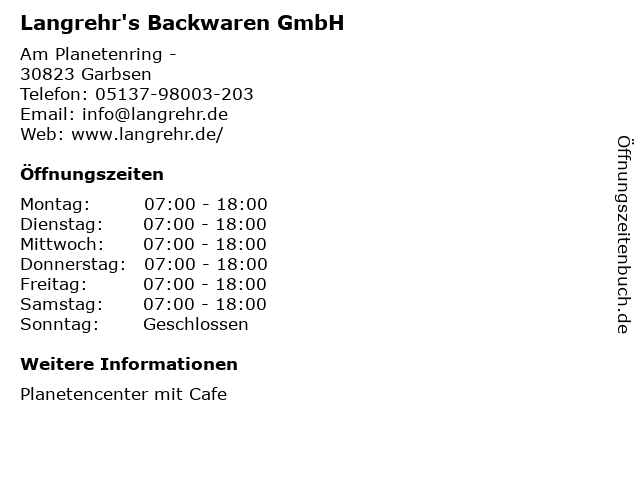 Langrehr's Backwaren GmbH in Garbsen: Telefonnummer, Öffnungszeiten und Adresse