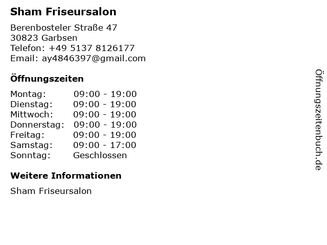 | Öffnungszeiten Sham Friseursalon in Garbsen anzeigen | |