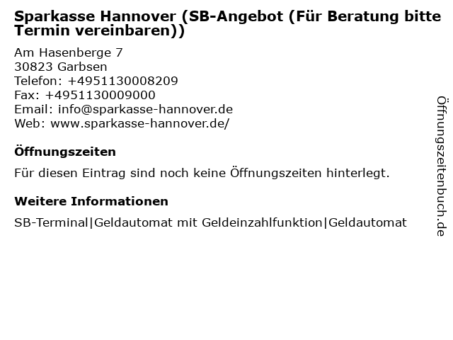 Sparkasse Hannover (SB-Center) in Garbsen: Telefonnummer, Öffnungszeiten und Adresse