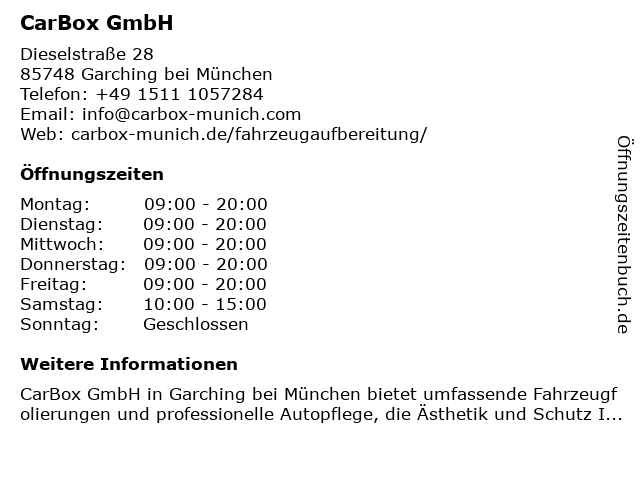 | Öffnungszeiten CarBox GmbH in Garching bei München anzeigen | |