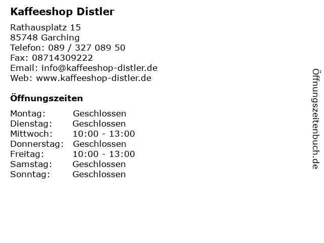 | Öffnungszeiten Kaffeeshop Distler in Garching anzeigen | |