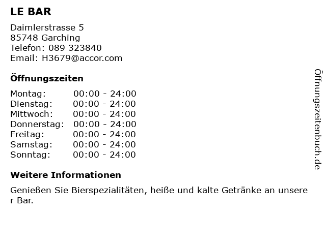 | Öffnungszeiten LE BAR in Garching anzeigen | |