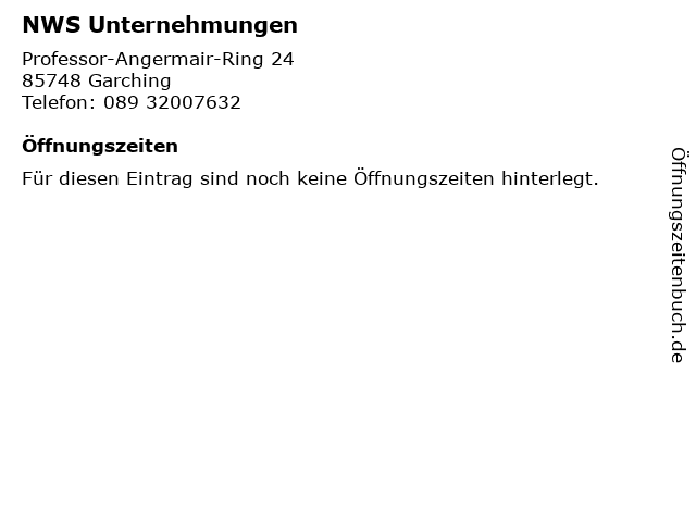 | Öffnungszeiten NWS Unternehmungen in Garching anzeigen | |