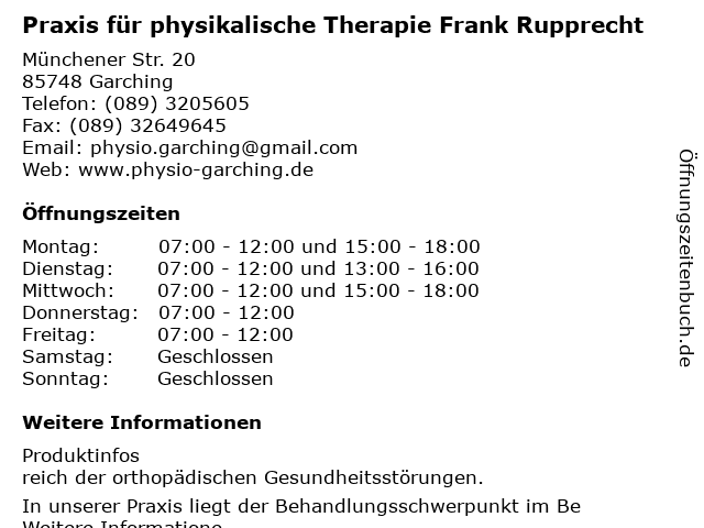1 Krankengymnastik u. Massage Praxis für Physikalische Therapie Tschiers (Entfernung: 7,98 km) Ittlingerstr. 53, 80933 München 2 Christoph Bock Praxis für Physikalische Therapie (Entfernung: 12,26 km) Wagenbauerstr. 12, 81677 München 3 Reha-Med GmbH Praxis f. Krankengymnastik u. physikalische Therapie (Entfernung: 13,30 km) Nymphenburger Str. 92, 80636 München 6 Andreas Schlegel Physikalische Therapie Fußreflexzonenmasage (Entfernung: 13,62 km) Josephsburgstr. 71, 81673 München |