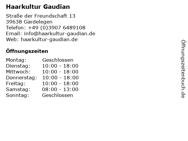 | Öffnungszeiten Haarkultur Gaudian in Gardelegen anzeigen | |