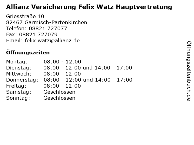 1 Allianz Versicherung Marc Streng Hauptvertretung (Entfernung: 0,39 km) Klammstraße 16, 82467 Garmisch-Partenkirchen 2 Allianz Versicherung Ivan Mamic Hauptvertretung (Entfernung: 1,66 km) Hauptstraße 76, 82467 Garmisch-Partenkirchen 3 KACHELÖFEN FELIX REINDL BAUWAREN BOZEN FLIESEN (Entfernung: 1,71 km) Unterfeldstr. 12, 82467 Garmisch-Partenkirchen 4 Allianz Versicherung Andre Philippe von Zitzewitz Hauptvertretung (Entfernung: 4,93 km) Waxensteinstraße 3, 82491 Grainau 5 Allianz Versicherung Christian Dirner Hauptvertretung (Entfernung: 8,45 km) Hauptstraße 10 a, 82496 Oberau 6 Allianz Versicherung Ralf Marte Hauptvertretung (Entfernung: 14,48 km) Fritz-prölß-platz 16, 82481 Mittenwald |