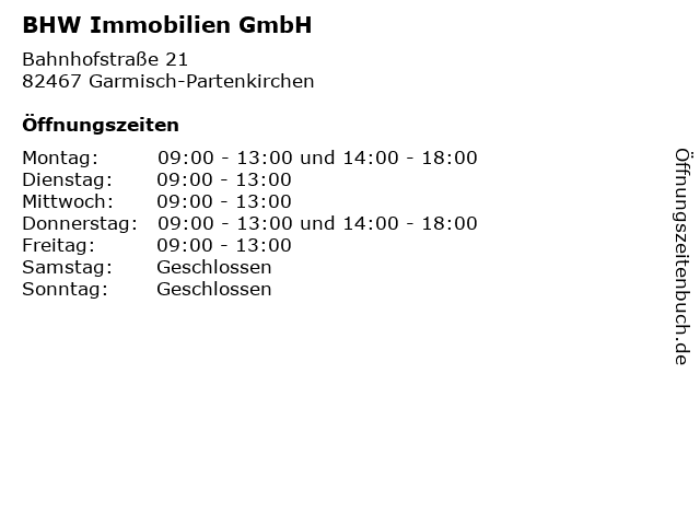 Öffnungszeiten BHW Immobilien GmbH in Garmisch-Partenkirchen anzeigen | |