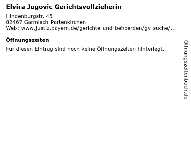 | Öffnungszeiten Elvira Jugovic Gerichtsvollzieherin in Garmisch-Partenkirchen anzeigen | |
