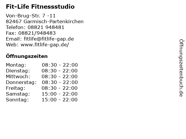 2 Therapie Zirkel - Fitnessstudio, Krankengymnastik, Physiotherapie, Osteopathie (Entfernung: 0,57 km) Bahnhofstr. 24, 82467 Garmisch-Partenkirchen 3 Fit für Schule & Beruf Trainings-Center GbR (Entfernung: 0,84 km) Hindenburgstr. 23, 82467 Garmisch-Partenkirchen 4 Fitnessstudio Ernst Lichtmannegger (Entfernung: 0,99 km) Drosselstr. 11, 82467 Garmisch-Partenkirchen 6 FiT - Fachbüro für Informationstechnik Dipl.-Inf. (FH) Thomas Schäfer und Dipl.-Ing. (FH) Anette Schäfer GbR (Entfernung: 4,23 km) Danielstr. 2, 82491 Grainau |