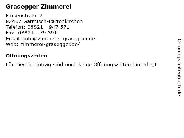 1 Andreas Grasegger, Christa Zimmerei (Entfernung: 0,24 km) Drosselstr. 16, 82467 Garmisch-Partenkirchen 2 Peter Grasegger Elektroinstallation (Entfernung: 1,17 km) Münchner Str. 25 A, 82467 Garmisch-Partenkirchen 6 |
