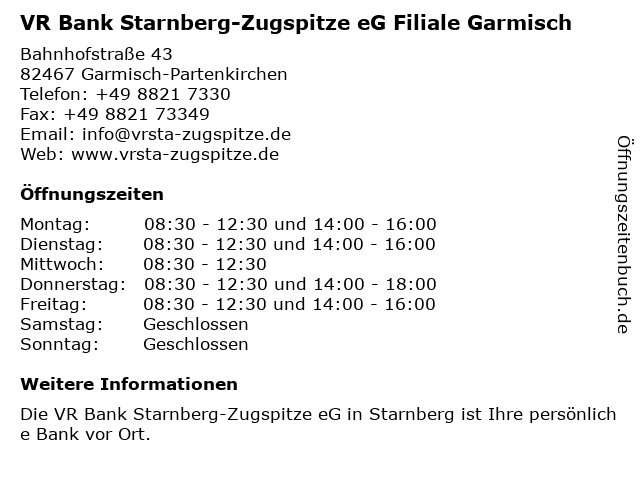 1 VR Bank Starnberg-Zugspitze eG Filiale Garmisch (Entfernung: 0,00 km) Bahnhofstraße 43, 82467 Garmisch-Partenkirchen 2 Geldautomat VR Bank Starnberg-Zugspitze eG (Entfernung: 0,00 km) Bahnhofstraße 43, 82467 Garmisch-Partenkirchen 3 VR Bank Starnberg-Zugspitze eG SB-Filiale Garmisch-Partenkirchen (Entfernung: 0,14 km) Von-Brug-Straße 7-11, 82467 Garmisch-Partenkirchen 4 Geldautomat VR Bank Starnberg-Zugspitze eG (Entfernung: 0,16 km) Von-Brug-Straße 7-11, 82467 Garmisch-Partenkirchen 6 |