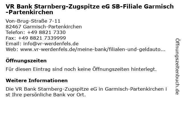 | VR Bank Starnberg-Zugspitze eG SB-Filiale Garmisch-Partenkirchen anrufen | |