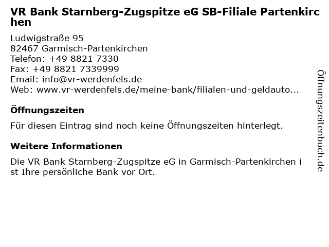 | VR Bank Starnberg-Zugspitze eG SB-Filiale Partenkirchen anrufen | |