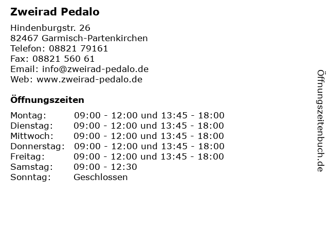 | Öffnungszeiten Zweirad Pedalo in Garmisch-Partenkirchen anzeigen | |