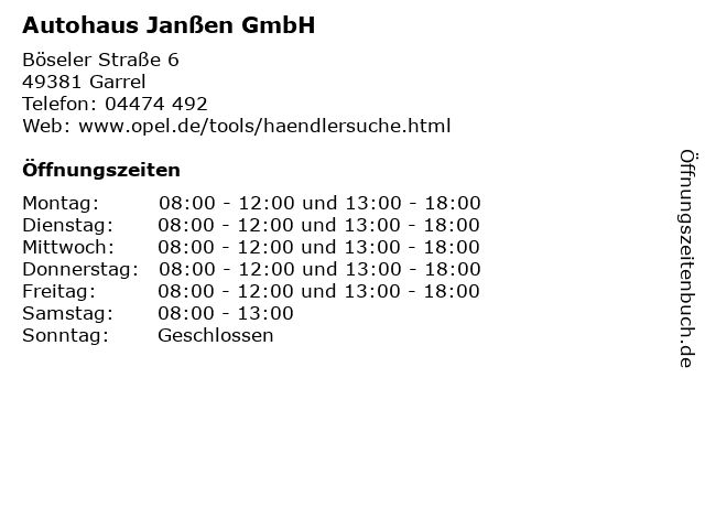 | Öffnungszeiten Autohaus Janßen GmbH in Garrel anzeigen | |