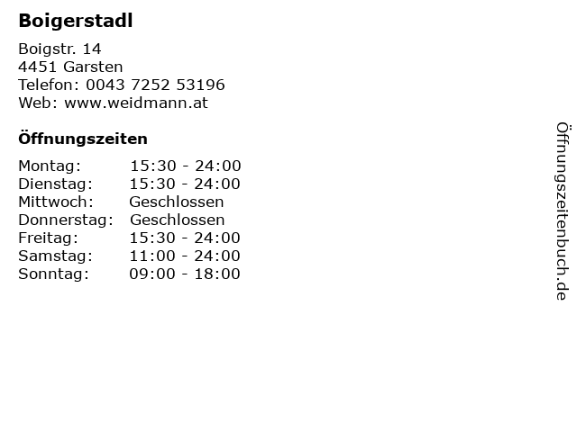 | Öffnungszeiten Boigerstadl in Garsten anzeigen | |