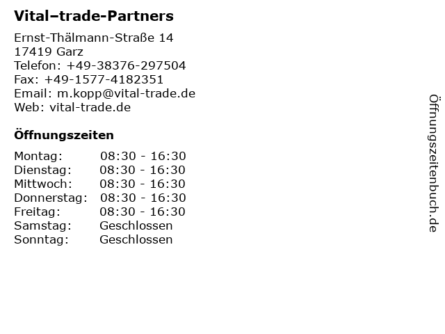| Öffnungszeiten Vital–trade-Partners in Garz anzeigen | |