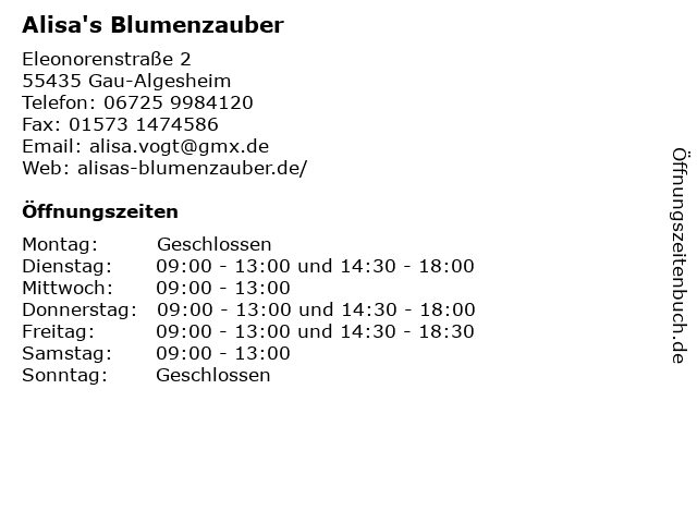 | Öffnungszeiten Alisa's Blumenzauber in Gau-Algesheim anzeigen | |