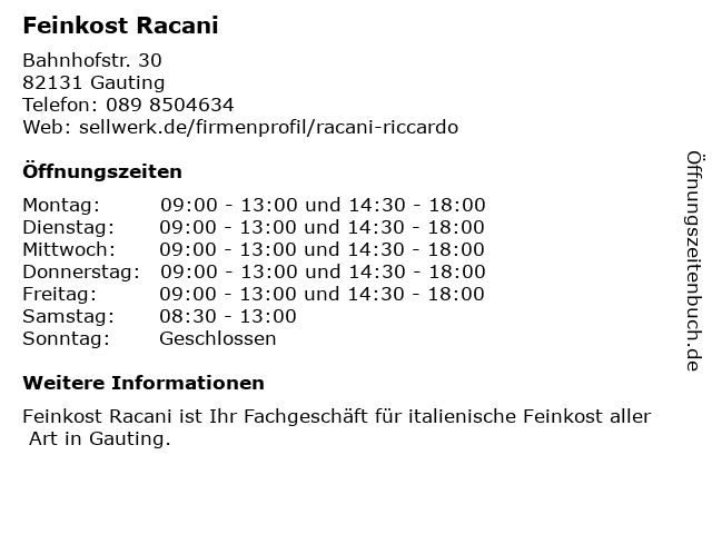 | Öffnungszeiten Feinkost Racani in Gauting anzeigen | |