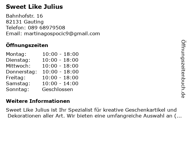 | Öffnungszeiten Sweet Like Julius in Gauting anzeigen | |