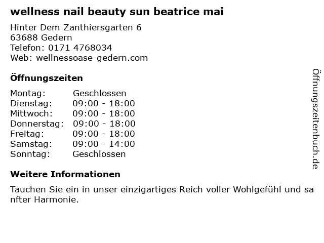 Branchen & Suchbegriffe zu wellness nail beauty sun beatrice mai:beatrice, beauty, klinik für permanent make-up, mai, nagelstudio, nail, schönheitssalon, spa, sun, wellness |