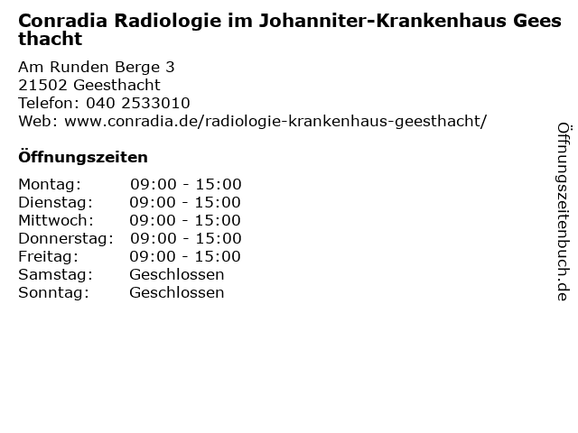 1 Conradia Radiologie im Johanniter-Krankenhaus Geesthacht (Entfernung: 0,01 km) Am Runden Berge 3, 21502 Geesthacht 5 Johanniter Mutter Eva von Tiele-Winckler-Pflegeheim - Verwaltung (Entfernung: 11,30 km) Am Burgberg 2, 21465 Wentorf 6 Conradia Radiologie im Bethesda Krankenhaus Bergedorf (Entfernung: 11,57 km) Glindersweg 80, 21029 Hamburg |