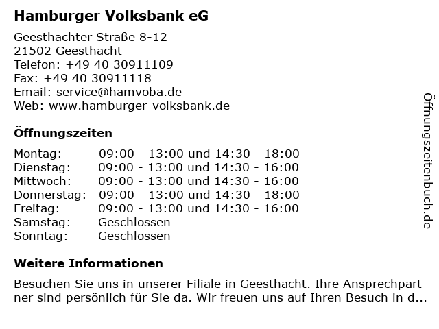 | Öffnungszeiten Hamburger Volksbank eG in Geesthacht anzeigen | |