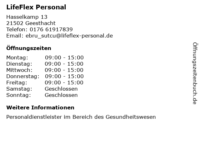 | Öffnungszeiten LifeFlex Personal in Geesthacht anzeigen | |