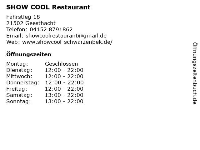 | Öffnungszeiten SHOW COOL Restaurant in Geesthacht anzeigen | |