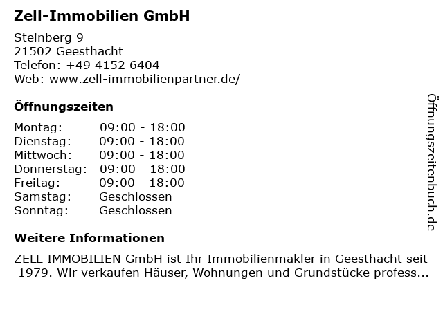 | Öffnungszeiten Zell-Immobilien GmbH in Geesthacht anzeigen | |