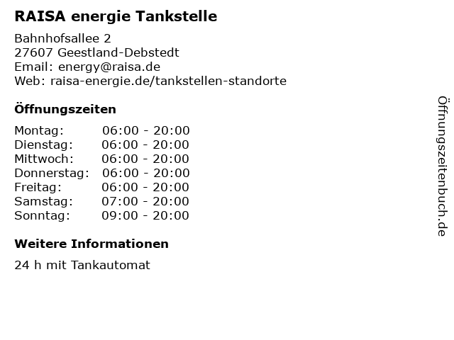 | Öffnungszeiten RAISA energie Tankstelle in Geestland-Debstedt anzeigen | |