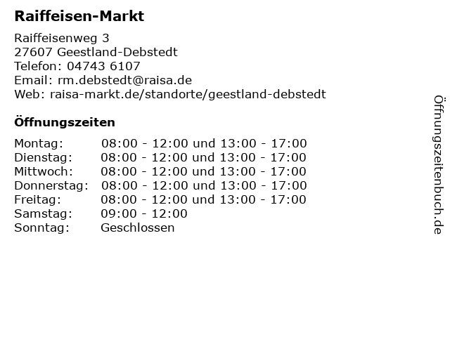 | Öffnungszeiten Raiffeisen-Markt in Geestland-Debstedt anzeigen | |