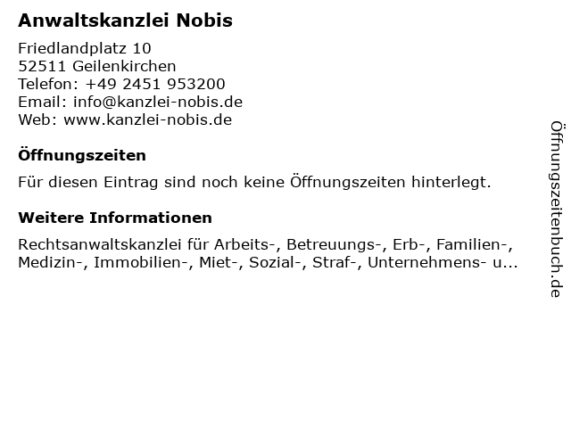 | Öffnungszeiten Anwaltskanzlei Nobis in Geilenkirchen anzeigen | |