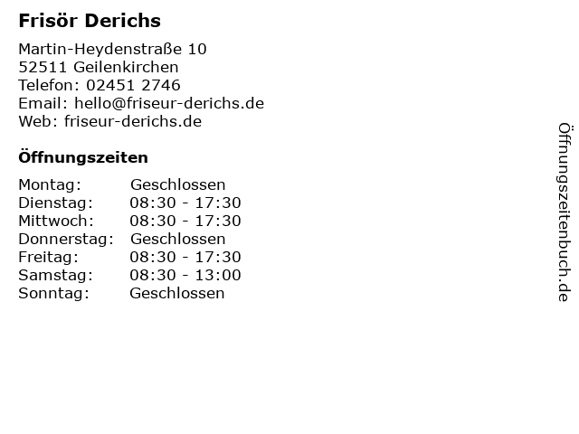 | Öffnungszeiten Frisör Derichs in Geilenkirchen anzeigen | |